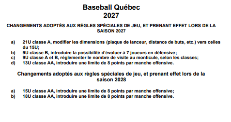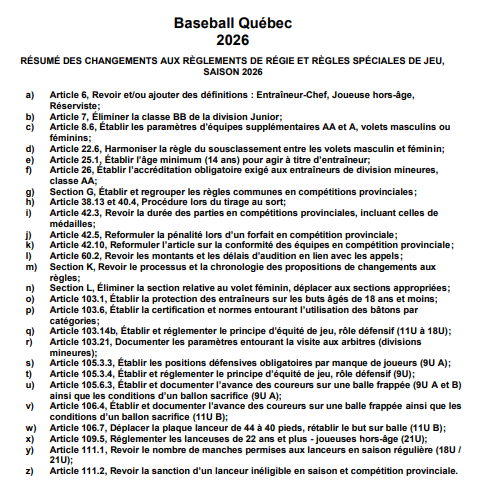 Cadre administratif qui encadre la structure du baseball au Québec : affiliations, inscriptions, catégories, normes et responsabilités des associations.- Résumé des changements aux Règlements de régie et Règles spéciales de jeu (2026)